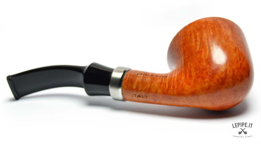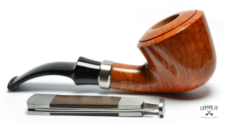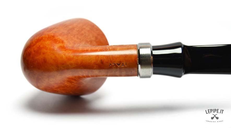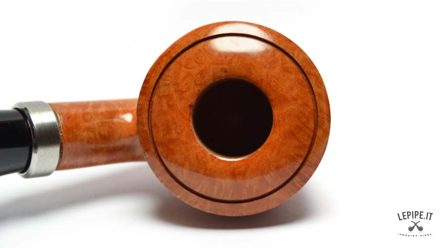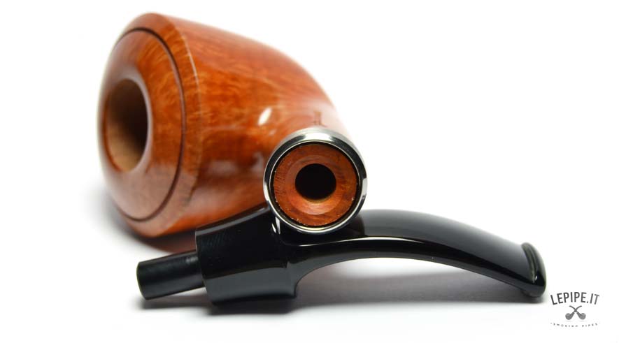 The shank and stem are joined by a brushed metal band, providing a smooth transition to the glossy black, gently bent stem. With a 20 mm internal diameter, the bowl is ideal for controlled, focused smokes. As always, Fabrizio Romeo demonstrates his technical skill and aesthetic finesse, crafting a pipe that expresses both restraint and elegance.